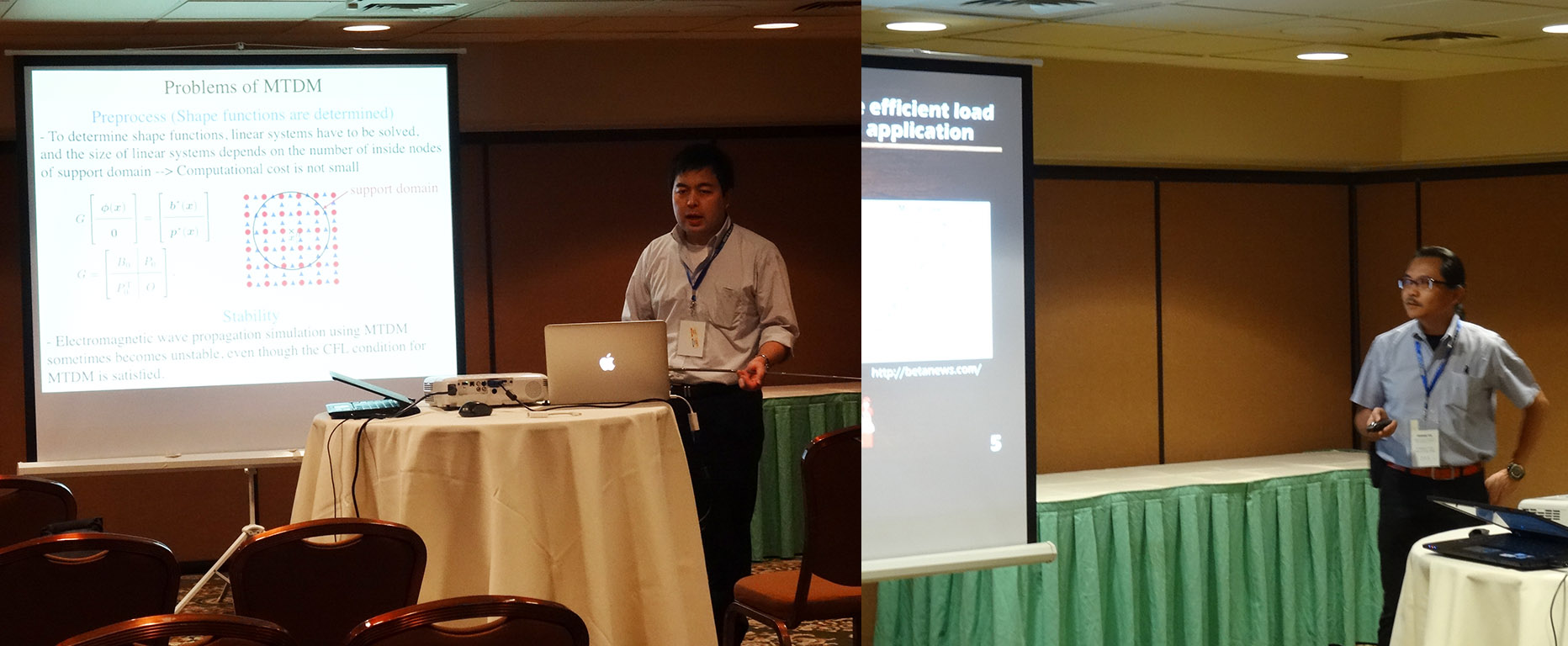 7月20日から25日に米国・ネバダ州・リノで開催中の国際会議ICCES 2015に数理情報工学科から3名の先生方が学生の皆さんとの共同研究の成果を発表するため参加されています.21日には角田先生が”Complicated Fluid Flow Simulations by Particle Methods Using Hyperbolic-type Kernel Functions”というタイトルで粒子法による流体シミュレーション法とその成果について発表されました.会場からは実行環境や性能に関する質問が出た他,他の発表者に対する質疑応答の中では格子法(メッシュを用いる方法)と粒子法(メッシュを用いない方法)の双方がこのセッションでは成果が発表されていて大変興味深いとコメントされた先生がいました.