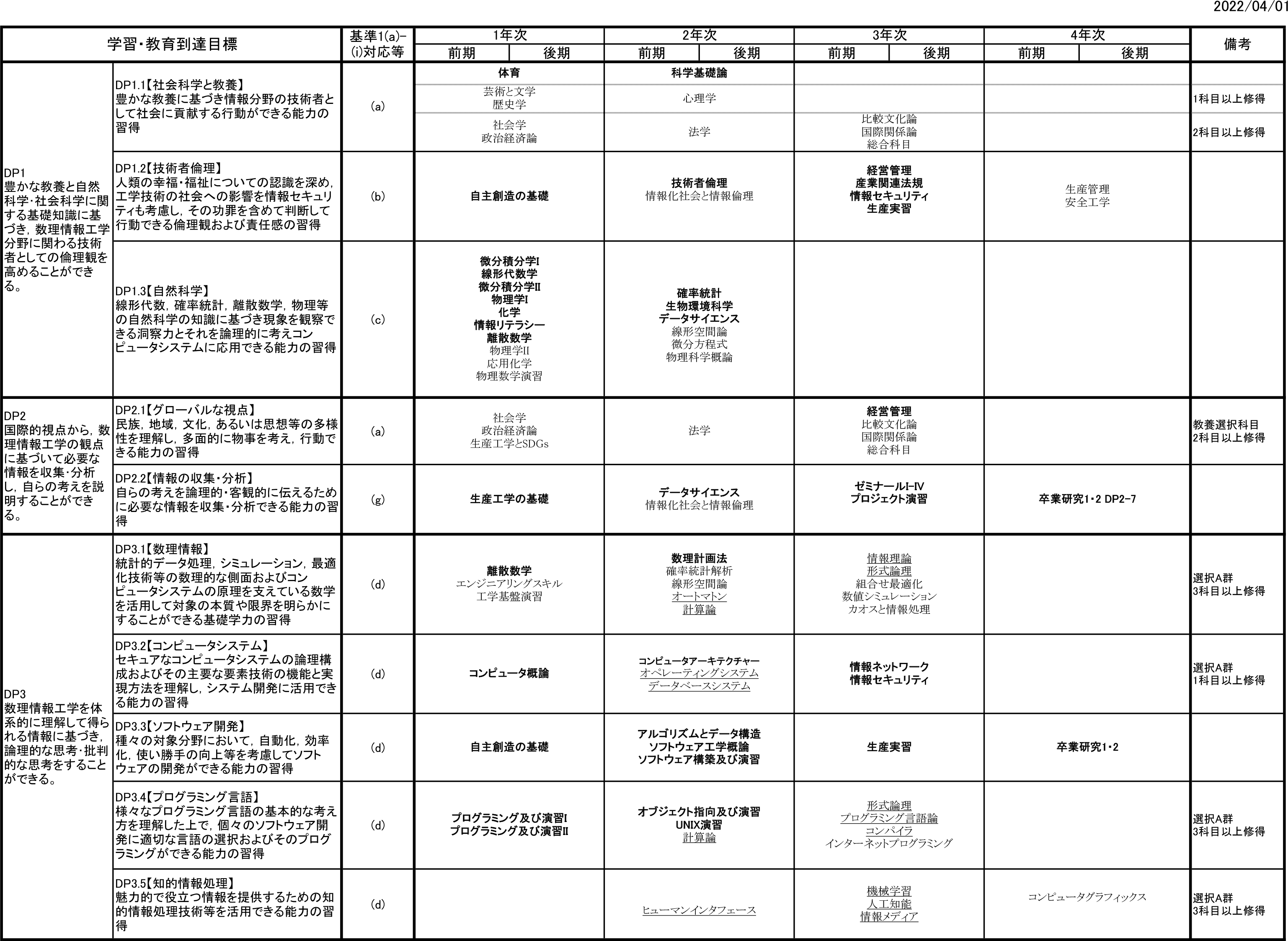 本プログラムの学習・教育到達目標は,大項目を学科のディプロマ・ポリシーと一致させ,各大項目にいくつかの小項目を定めています。このため,本プログラムでは,学生が4年間で卒業要件を満たすように128単位修得することにより,いずれの選択科目の組合せでも学習・教育到達目標の大項目だけではなくすべての学習・教育到達目標の小項目を達成できるようにカリキュラムを設計しています。